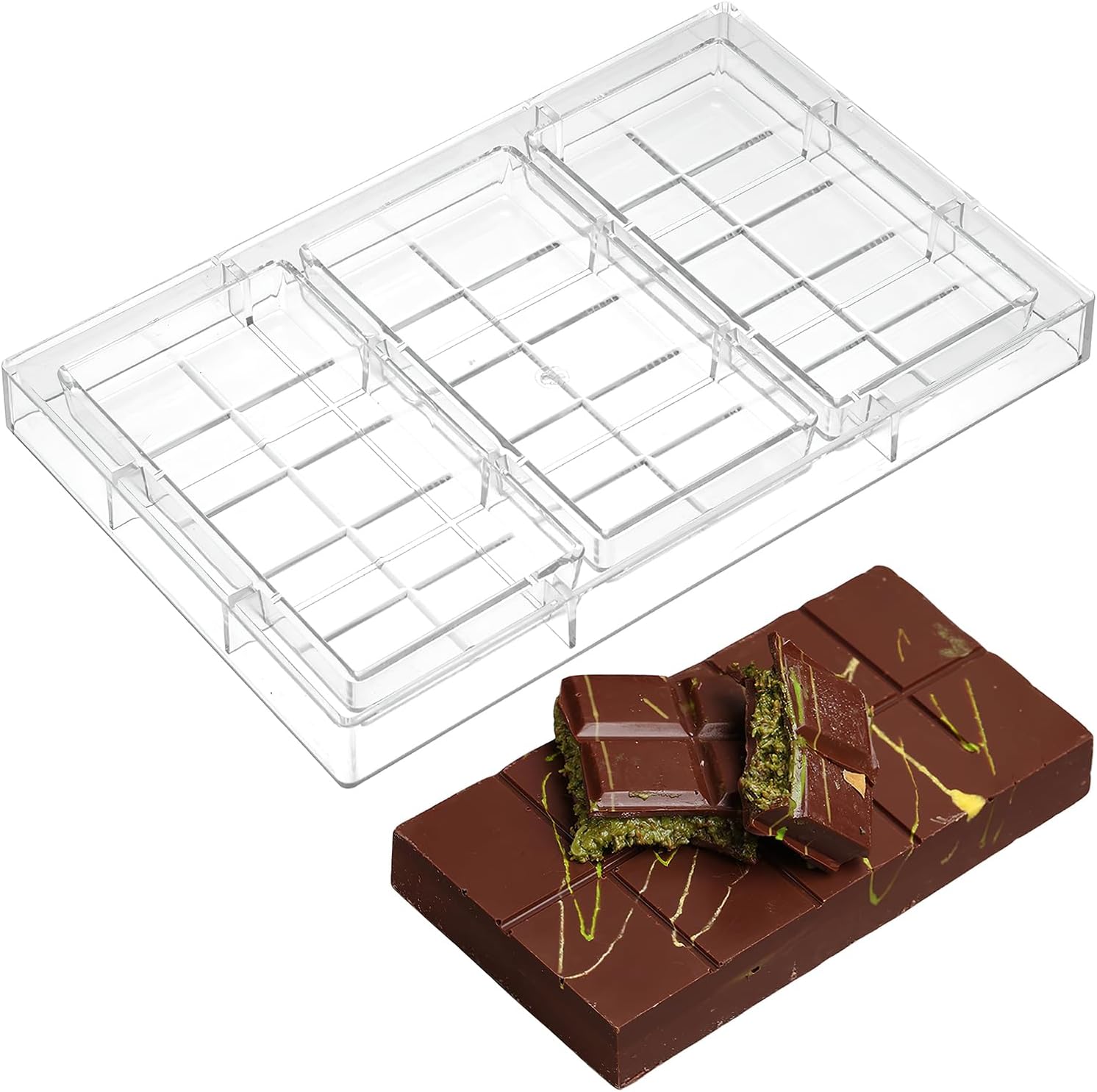 PERFECT FOR BEGINNERS AND PROFESSIONALS: Chef-Professional Grade Mold This polycarbonate chocolate mold is the top choice for professional chocolatiers, delivering detailed and consistent results every time. Designed to replicate classic chocolates, this 3-cavity deep-fill segmented chocolate bar mold produces three bars per use, allowing you to effortlessly recreate the unique texture and appearance of iconic Dubai-style chocolate bars. It fulfills your craving for exotic delicacies with precision and ease